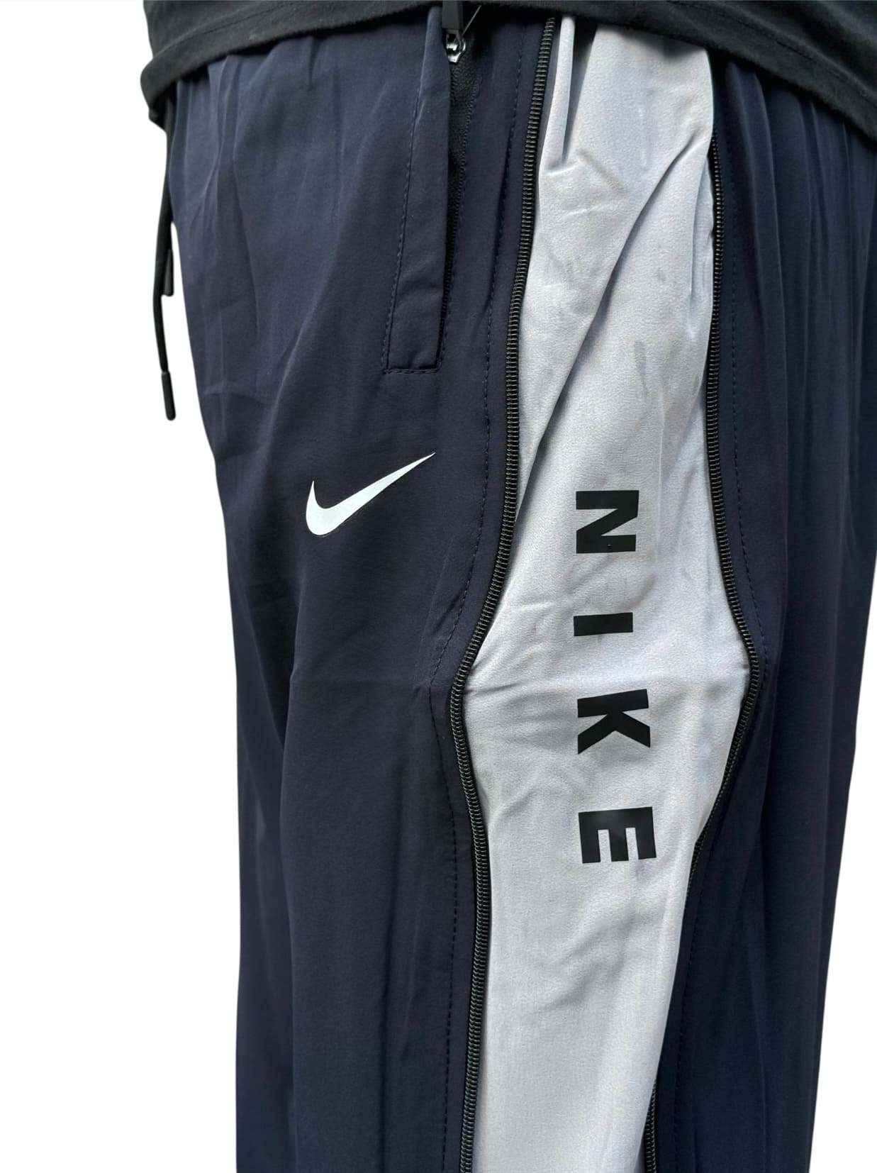 The trouser features a sleek full-length side zip that opens completely to reveal a shiny silver contrast panel, giving it a modern, sporty vibe. With its deep navy base and metallic-inspired silver detail, this trouser is the perfect mix of performance and streetwear style.